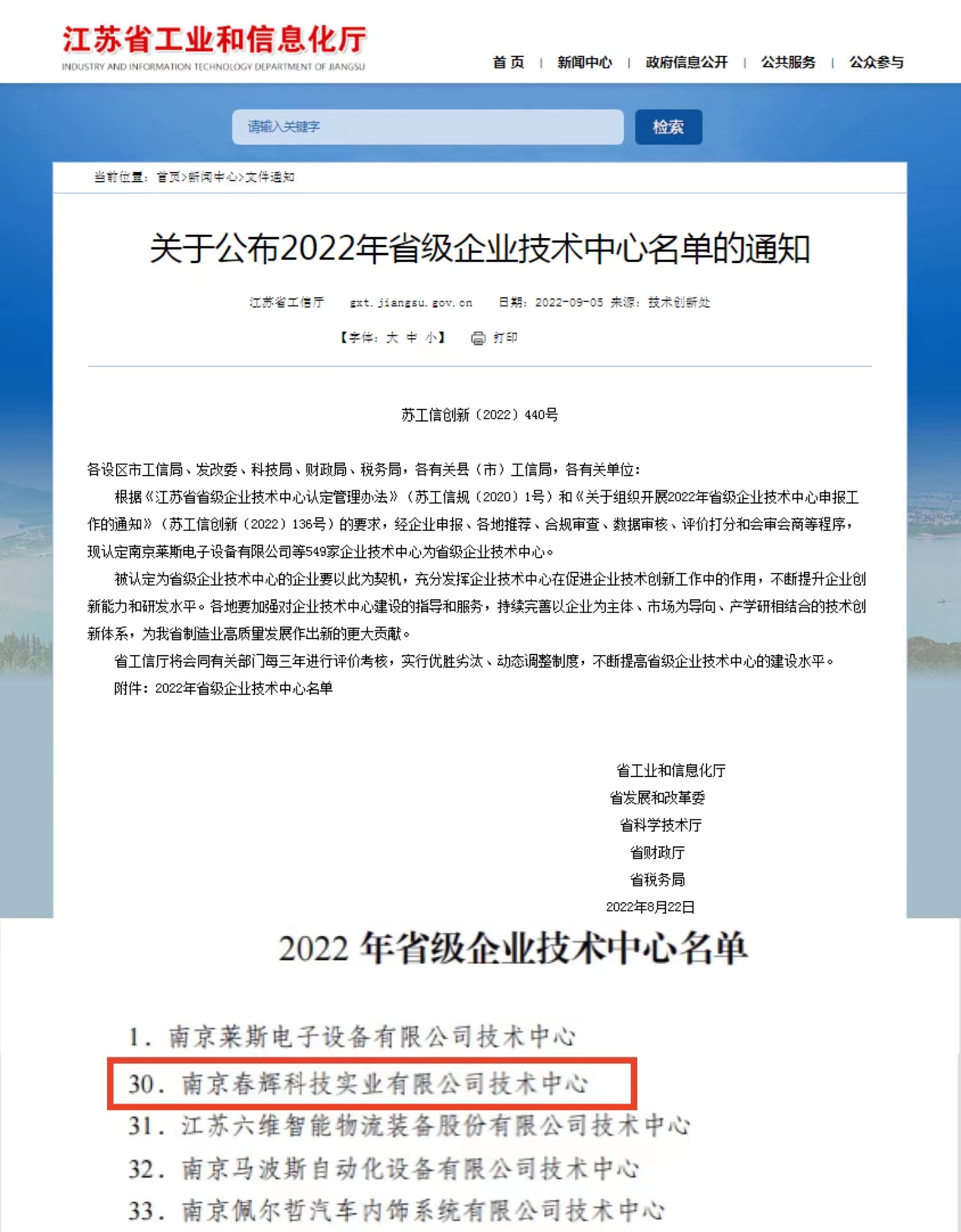 近日,江蘇省工業(yè)和信息化廳公布了2022年江蘇省省級企業(yè)技術(shù)中心認定名單,南京春輝科技實(shí)業(yè)有限公司榜上有名,被認定為江蘇省企業(yè)技術(shù)中心。“省級企業(yè)技術(shù)中心”申請認定條件多,審批流程嚴格,不僅在企業(yè)規模等經(jīng)濟指標上有較高的要求,而且更注重創(chuàng )新能力,是對企業(yè)研發(fā)實(shí)力的權威性認可和高度肯定。